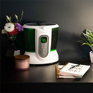 The Spruce tested the Console and rated it a Top Pick. It was also rated Best for the Whole House by Prevention Magazine. It has a large removable tank, long run time between refills, and a built-in humidistat so you can select your desired humidity level and let the Console do the rest. An optional demineralization cartridge can be used to extend the wick's life by removing the minerals naturally found in tap water.